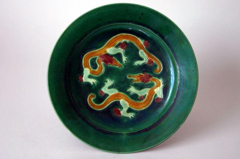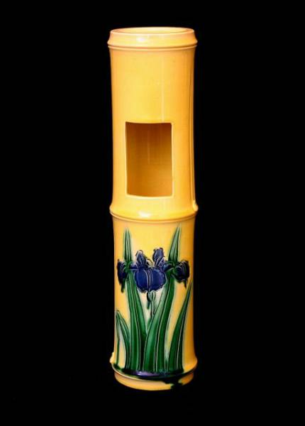 Through the 1880's and 90's, the Danto and Sanpei kilns, evidently influenced by their clients in the West, began to shift their styles. As the export market developed Awaji pottery evolved from a distinctive regional style intended for domestic consumption to a pottery influenced by international tastes and markets. Despite this influence from outside pressures, the Awaji pottery retained its unique regional flavor. The forms became simpler and more organic; the decoration parsed to a spare and bold, but still spontaneously confident manner. Bright green, yellow, and blue glaze grounds were used both as monochromes to show off the forms, or as grounds under carved, incised and applied decorations highlighted with other blending and contrasting colors.