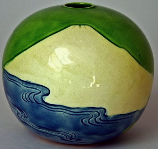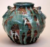 The Awaji potters were obviously aware of the International art movements of the late 19th and early 20th centuries. In response to the Art Nouveau style they used sensuous, organic, forms with sweeping curves and handles. These forms were accented by two tone glazes which melted into one another with hypnotic effect. These forms gave way to the boldly geometric style of the Art Deco movement. These are characterized by architecturally squared buttress handles and feet, along with rocket and other space-age forms. The Deco then gave way to the Modern Movement. The pieces made during this last long movement are some of the most interesting of the Awaji output.